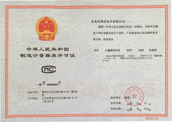 我公司是青島市具有國(guó)家質(zhì)量技術(shù)監(jiān)督部門(mén)頒發(fā)的計(jì)量器具生產(chǎn)許可證的生產(chǎn)企業(yè);獲得國(guó)家防爆電氣產(chǎn)品質(zhì)量監(jiān)督檢驗(yàn)中心頒發(fā)的防爆合格證;獲得國(guó)家公安部消防產(chǎn)品合格評(píng)定中心頒發(fā)的消防產(chǎn)品形式認(rèn)可證書(shū)。